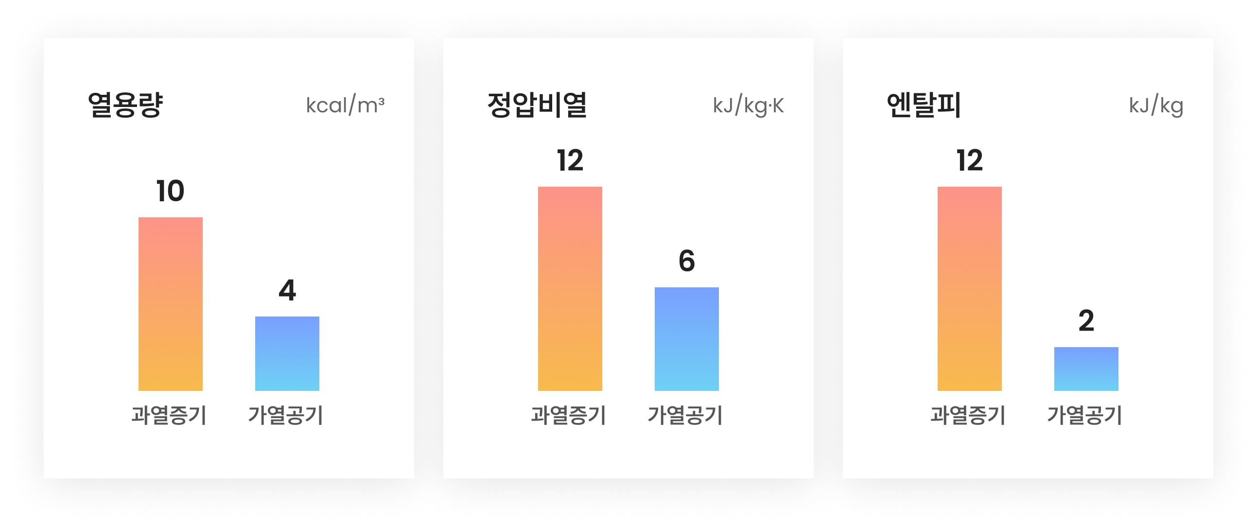 공기에 의한 전열은 대류 전열에 한함. 반면 과열증기는 대류 전열, 방사전열응축 전열에 의해서 전달 되는 복합 전열 작용이 발생하므로 열효율이 월등히 좋음