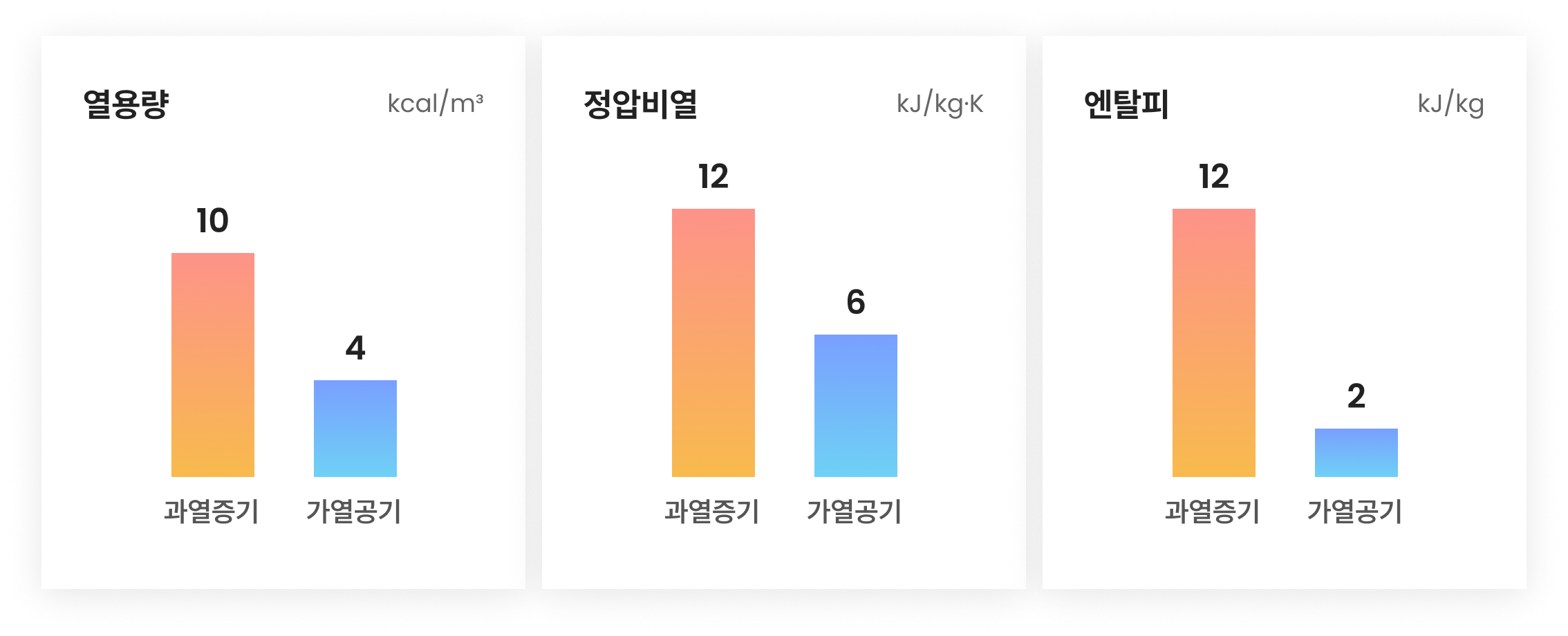 공기에 의한 전열은 대류 전열에 한함. 반면 과열증기는 대류 전열, 방사전열응축 전열에 의해서 전달 되는 복합 전열 작용이 발생하므로 열효율이 월등히 좋음